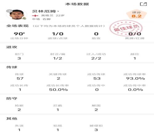 贝林厄姆战尤文全场数据:攻防兼备,门前补射打入制胜球