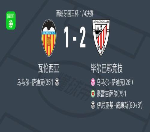 北京时间2月5日西班牙国王杯 1/4决赛,瓦伦西亚对阵毕尔巴鄂竞技。瓦伦西亚乌马尔-萨迪克破门,乌马尔-萨迪克自摆乌龙。毕尔巴鄂竞技伊尼亚基-威廉斯破门。最终比分瓦伦西亚 1-2 毕尔巴鄂竞技。