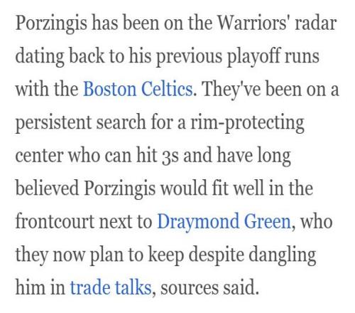 勇士队记表示在波尔津吉斯为凯尔特人打季后赛时,勇士就盯上了他。勇士一直在寻找能护筐能远投的中锋,他们始终认为,波尔津吉斯非常适合与追梦格林搭档内线,尽管此前曾把追梦放进交易筹码,但现在勇士计划留下这位功勋球员。