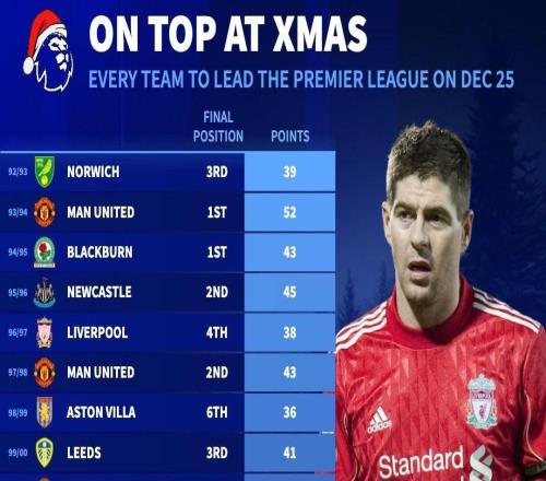 英超最近33支圣诞节登顶的球队有17支夺冠,近7年仅3队夺冠 -